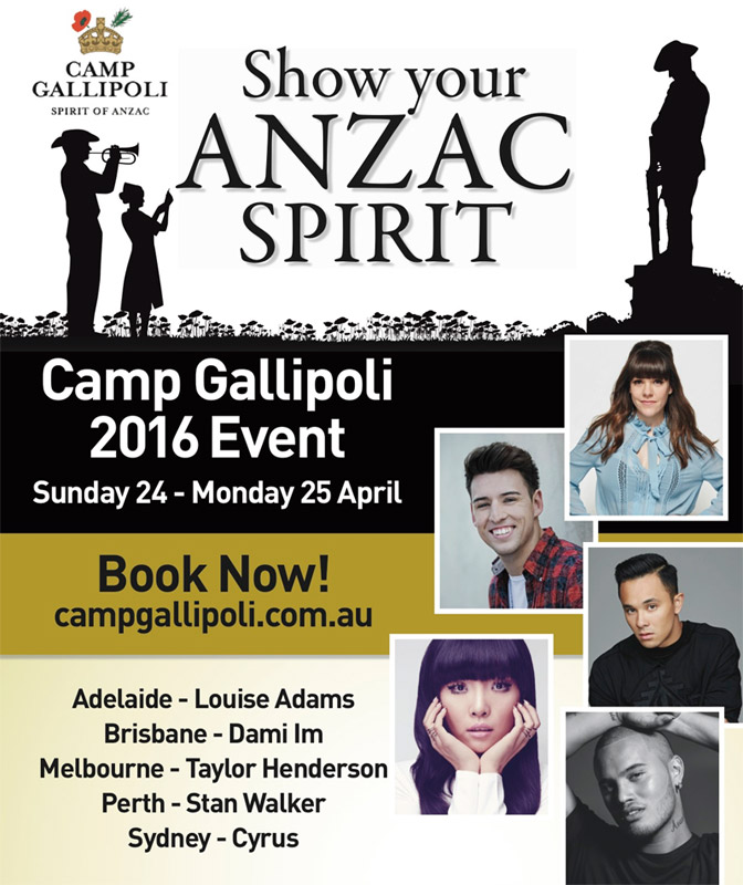 Camp Gallipoli is proud to have the support of Australia's top young artists performing live as part of the national commemorative events. Gates open at 3pm on Sunday 24 April, and will include special performances from Louise Adams (Adelaide), Dami Im (Brisbane), Taylor Henderson (Melbourne), Stan Walker (Perth), and Cyrus (Sydney). The music program also features local artists, school bands and choirs, interactive conversations and a number of very powerful films including 'The Last Anzacs".