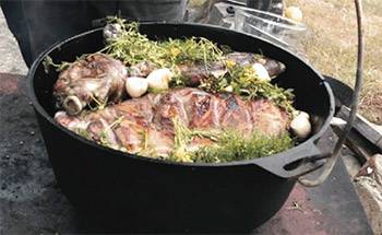 Place the various lamb parts and potatoes on separate sheets of foil and baking paper. Season with salt, pepper, add garlic, white wine, chilli, coriander, lemon zest, olive oil, thyme and rosemary. Wrap the goil into sealed parcels. Slowly cook on the BBQ (lid down) for 4 hours.