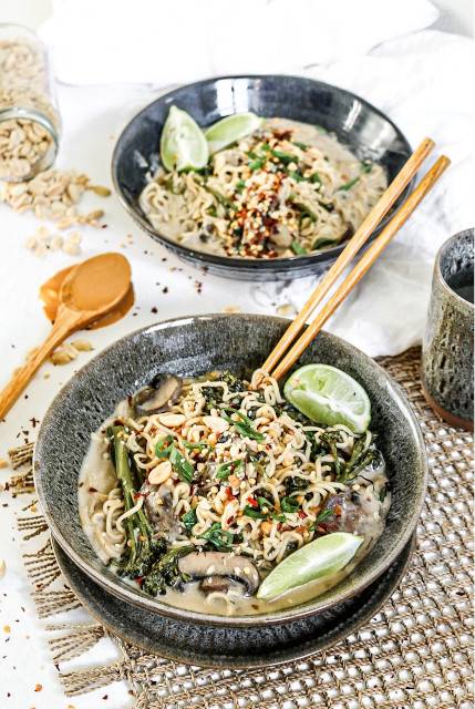 4. Bring to simmer again, then add ramen noodles and follow packet instructions for stove cooking time (approx. 3-5 minutes).