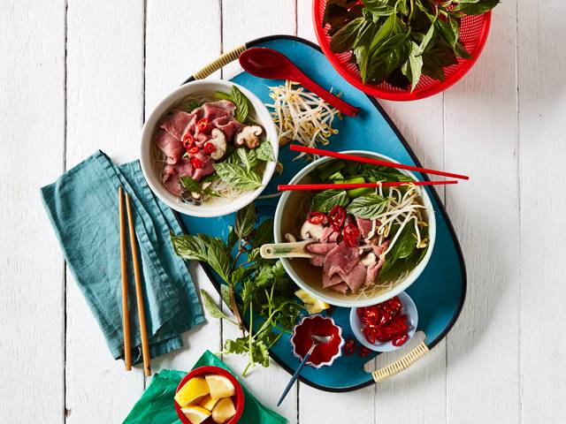 Divide noodles and 3/4 of sprouts between four large soup bowls. Top with lamb and ladle over hot broth. Serve topped with remaining sprouts and your choice of sliced chilli, coriander, Thai basil, chilli sauce and lemon wedges.