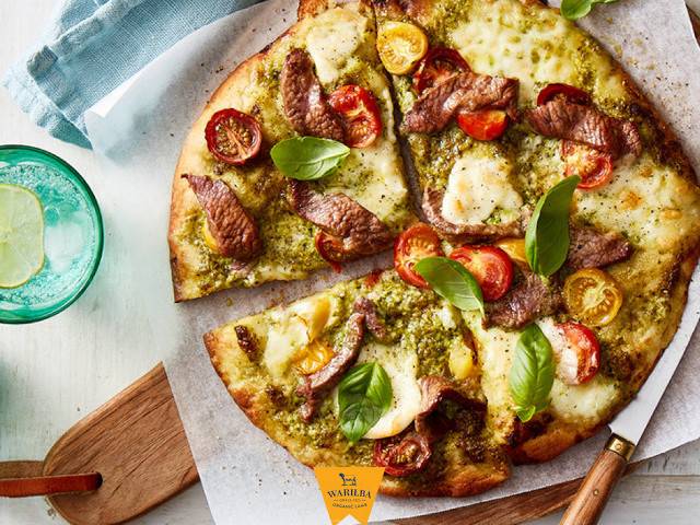 Place base on a pizza stone or tray and spread pesto evenly all over, leaving a 1cm border around the edge.